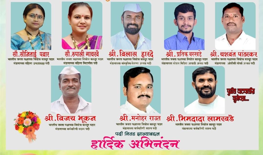 भारतीय जनता पक्षाच्या कानूर पठार निघोज मंडलाच्या उपाध्यक्ष व कार्यकारणी सदस्य मध्ये अनेकांची वर्णी लागले यामध्ये प्रामुख्याने सामाजिक कार्यकर्त्या सौ सोनाली ताई पवार यांचे उपाध्यक्ष म्हणून तर ग्रामपंचायत माजी सदस्य असलेल्या रूपाताई गायके यांना महिला चिटणीस पदी वर्णी लागली तसेच विलासराव हारदे प्रतीक वरखडे यशवंत पांढरकर विजय भुकन साहेब अल्पशांक समाजाचे कार्यकर्ते श्री मनोहर जी राऊत साहेब व श्रीराम भक्त व सामाजिक कार्यकर्ते श्री भीम दादा लामखडे या विविध सामाजिक कार्यकर्त्यांची निवड झाल्यामुळे निघोज मध्ये त्यांचा अल्पसंख्यामार्फत सत्कार करण्यात आला.