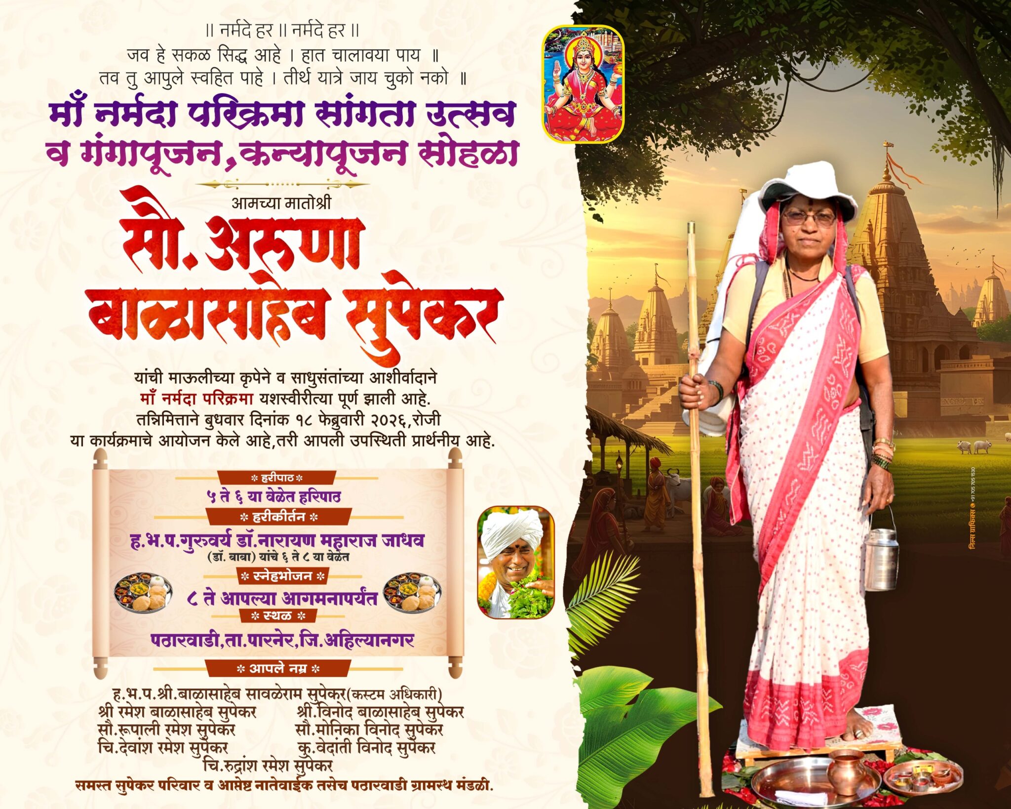 पठारवाडी निघोज तालुका पारनेर जिल्हा अहिल्यानगर येथील आमच्या वहिनी सोबत यांनी नुकतीच मन नर्मदा परिक्रमा तीन महिन्यात पूर्ण केली त्यानिमित्ताने त्यांनी परमपूजनीय नारायण महाराज जाधव आळंदी यांचे कीर्तन हरिपाठ भजन तसेच स्नेहभोजन सर्वांसाठी आयोजित केले असून बुधवार दिनांक 18 फेब्रुवारी 2026 रोजी हा कार्यक्रम त्यांच्या घरी होत आहे आपणही या कार्यक्रमास उपस्थित राहून नर्मदा मातीचा कृपा आशीर्वाद घ्यावा ही नम्र विनंती अतिशय स्वभावाच्या व धैर्यशील अशा भगिनी सौ अरुणाताई बाळासाहेब सुपेकर यांनी कोणाच्या वरही विसंबित न राहता अतिशय निष्ठेने व कष्टाने ही परिक्रमा केली आहे त्यामुळे सर्वत्र त्यांचे कौतुक होत असून त्यांचे पती श्री बाळासाहेब सावळेराम सुपेकर हे अतिशय सज्जनगृहस्था असून माजी कस्टमर अधिकारी आहेत अतिशय धार्मिक कुटुंब असलेले हा परिवार अशाच प्रकारे ईश्वर त्यांना भरपूर यश द्यावी अशी माता मळगंगे चरणी मी प्रार्थना करतो व माझ्या वर्ग मित्राला लाख लाख शुभेच्छा व सौ वहिनी ताईंना लाख लाख शुभेच्छा देतो व माता नर्मदा त्यांच्यावर कृपाशीर्वाद करो अशी माता मळगंगे चरणी प्रार्थना करतो.