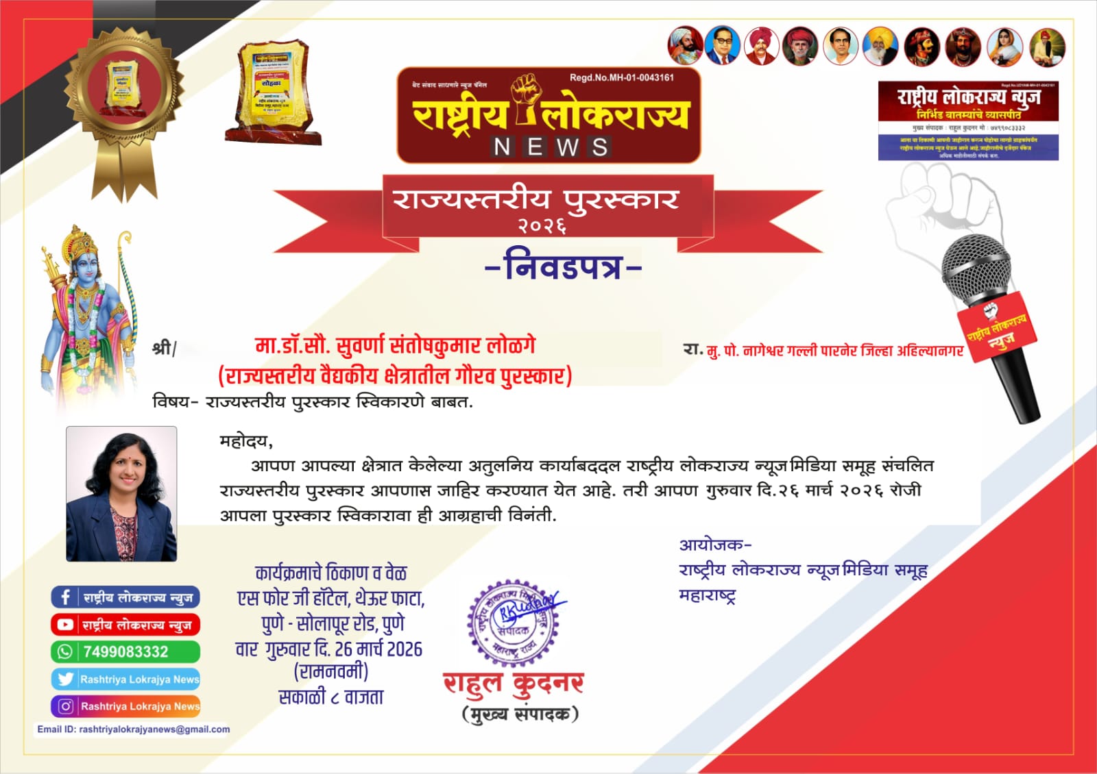 सविस्तर वृत्त असे की राष्ट्रीय लोकराज्य न्यूज मीडिया समूह महाराष्ट्र राज्य राज्यस्तरीय पुरस्कार सोहळा २०२६ यांच्याकडून दिला जाणारा पुरस्कार कोविड काळात व त्यानंतरही सातत्याने वैद्यकीय क्षेत्रात काम करणाऱ्या माननीय डॉक्टर सुवर्णाताई संतोष लोळगे यांना यावर्षीचा पुरस्कार जाहीर झाला आहे हा पुरस्कार सोहळा 26 मार्च रोजी घेण्यात येणार आहे हा सोहळा भव्य दिव्य असा असून पुणे येथे हा पुरस्कार वितरित केला जाणार आहे त्यांना हा पुरस्कार जाहीर झाल्यानंतर सर्वत्र त्यांचे कौतुक केले जात आहे हा पुरस्कार त्यांना जाहीर झाल्यानंतर वैद्यकीय क्षेत्र व इतर सर्व जनतेकडून त्यांचेअभिनंदन होत आहे सौ सुवर्णाताई संतोष लोळगे या सध्या प्राथमिक आरोग्य केंद्र पारनेर येथे कार्यरत आहेत.सध्या ग्रामीण रुग्णालय पारनेर येथे राष्ट्रीय बाल स्वास्थ्य कार्यक्रम अंतर्गत वैद्यकीय अधिकारी म्हणून कार्यरत आहेत.